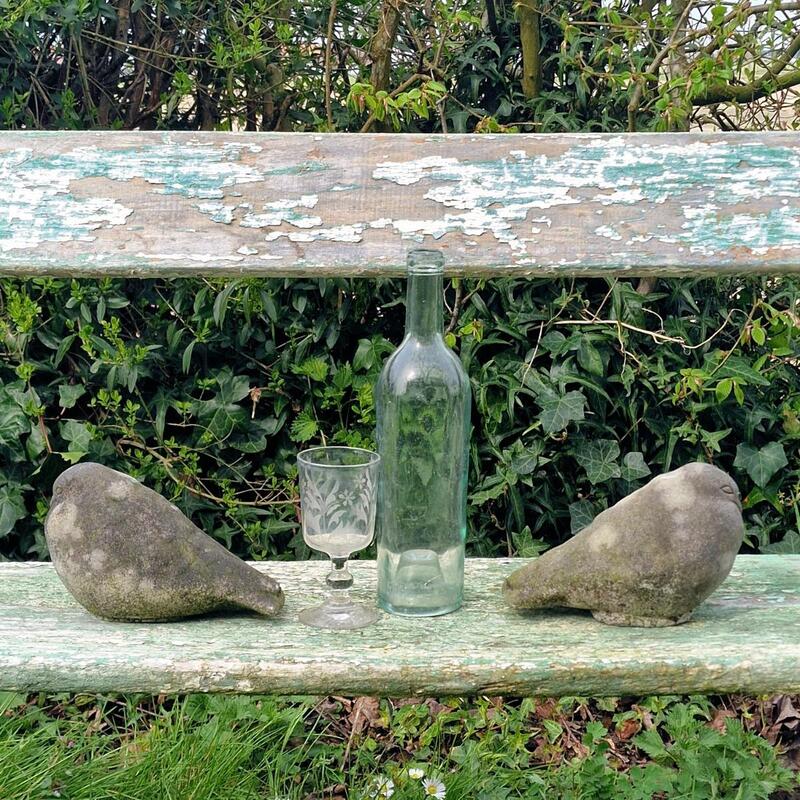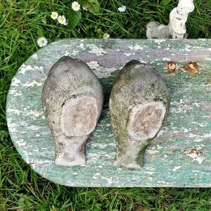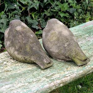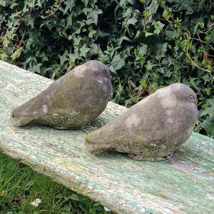 A wonderful pair of cast stone pigeons in a bloaty naive style, with a pleasing weathered patina, very good condition, France 1980