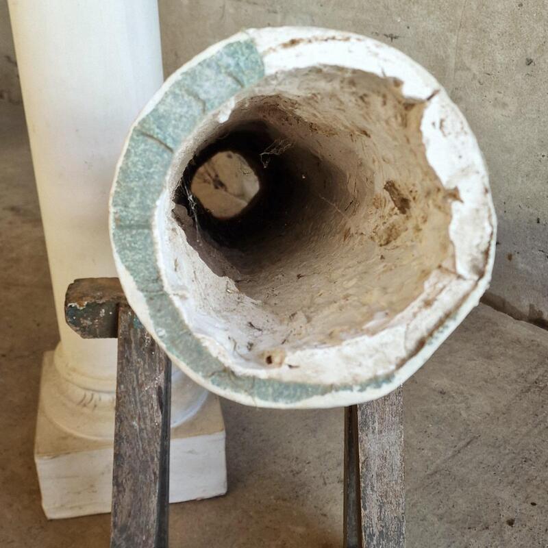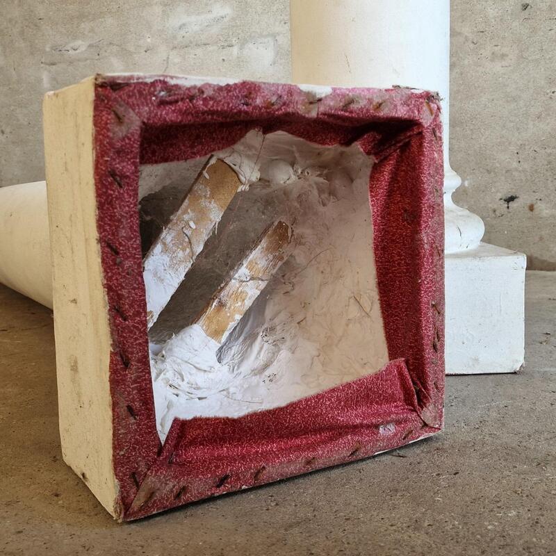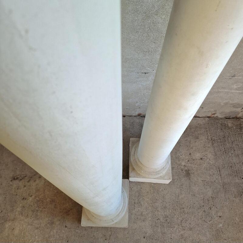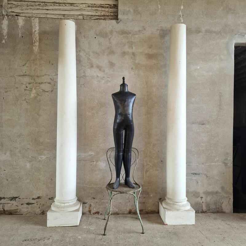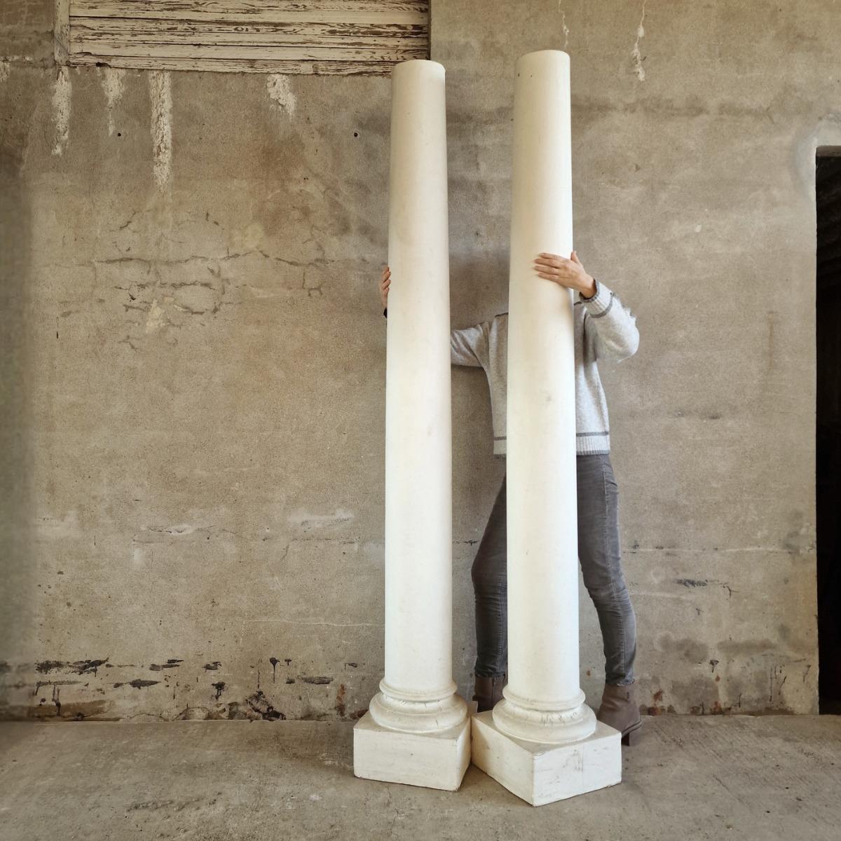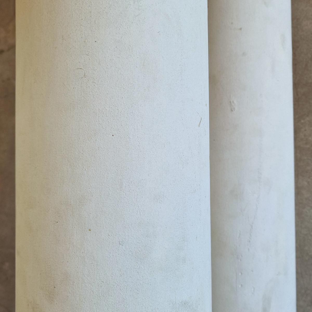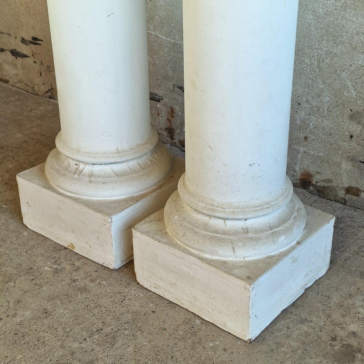 A simple dough pleasing pair of columns made of plaster and wood, white painted pillars on square bases for interior decoration, used to be theatre props, good condition, France 1970-80