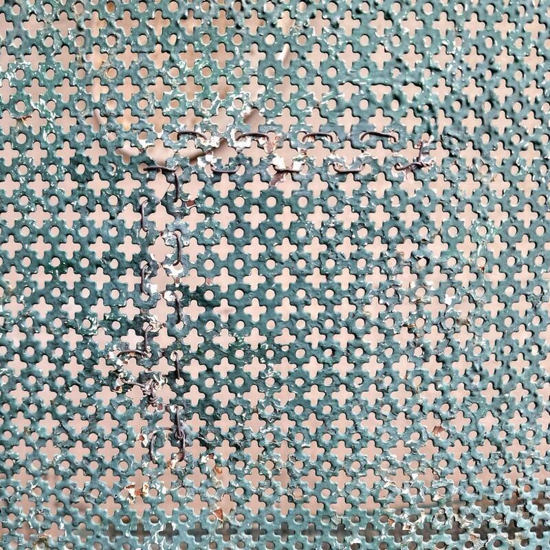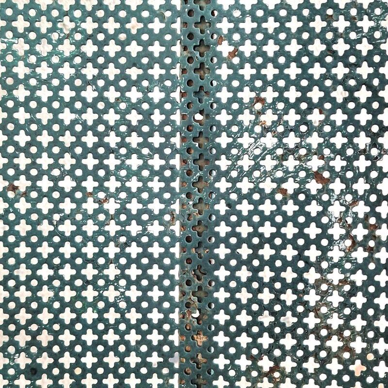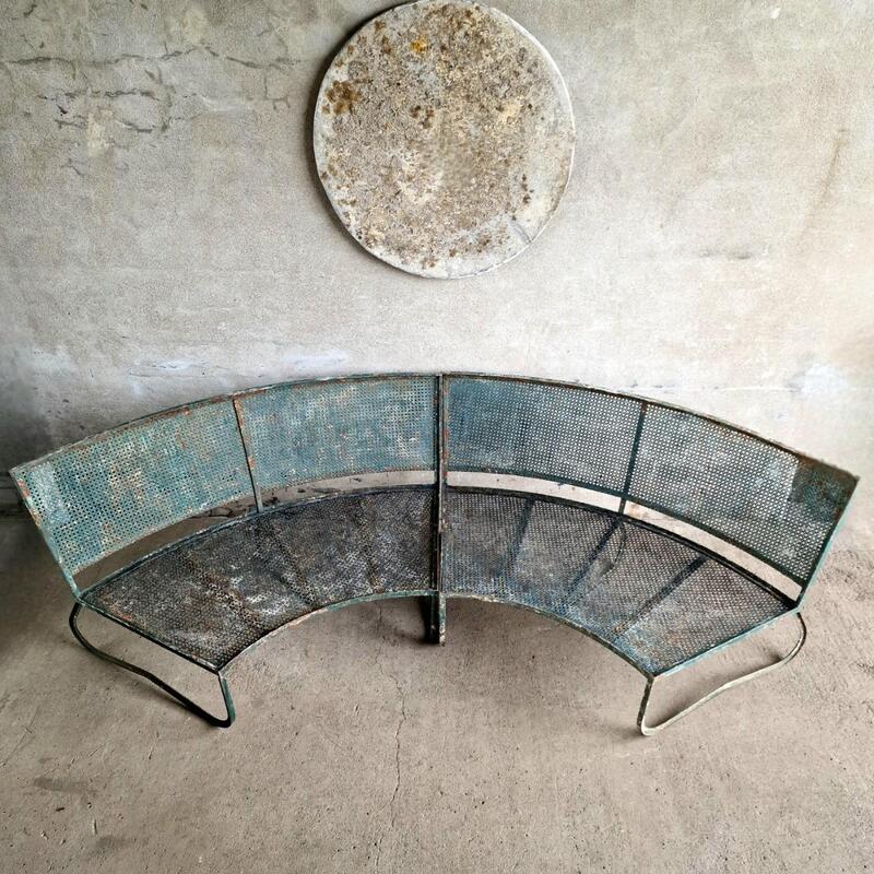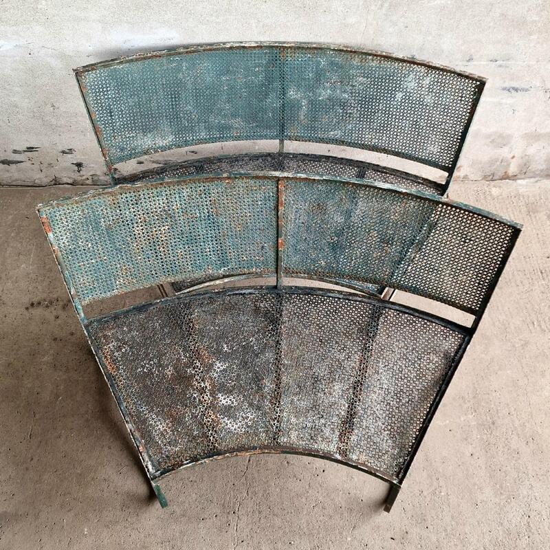 An fashionable pair of curved garden benches made of perforated metal in the Mategot style, weathered dark green paint, good condition with 3 handcrafted restorations in the seat and backside, but hardly visible (see last picture), France 1960