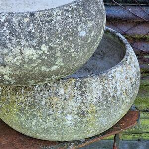 An attractive pair of round low planters made of cast stone with a desirable patina, drainage hole, very good condition, France 1970