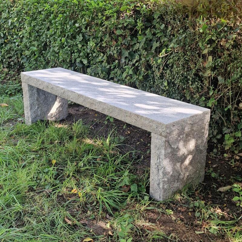 A fantastic primitive stone bench consisting of 3 thick light grey hand-carved granite parts, the feet can be put differently as they are not attached, slightly weathered patina, very good condition, Belgum 1 million years old but made in the 70ties