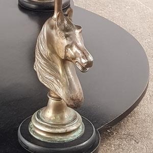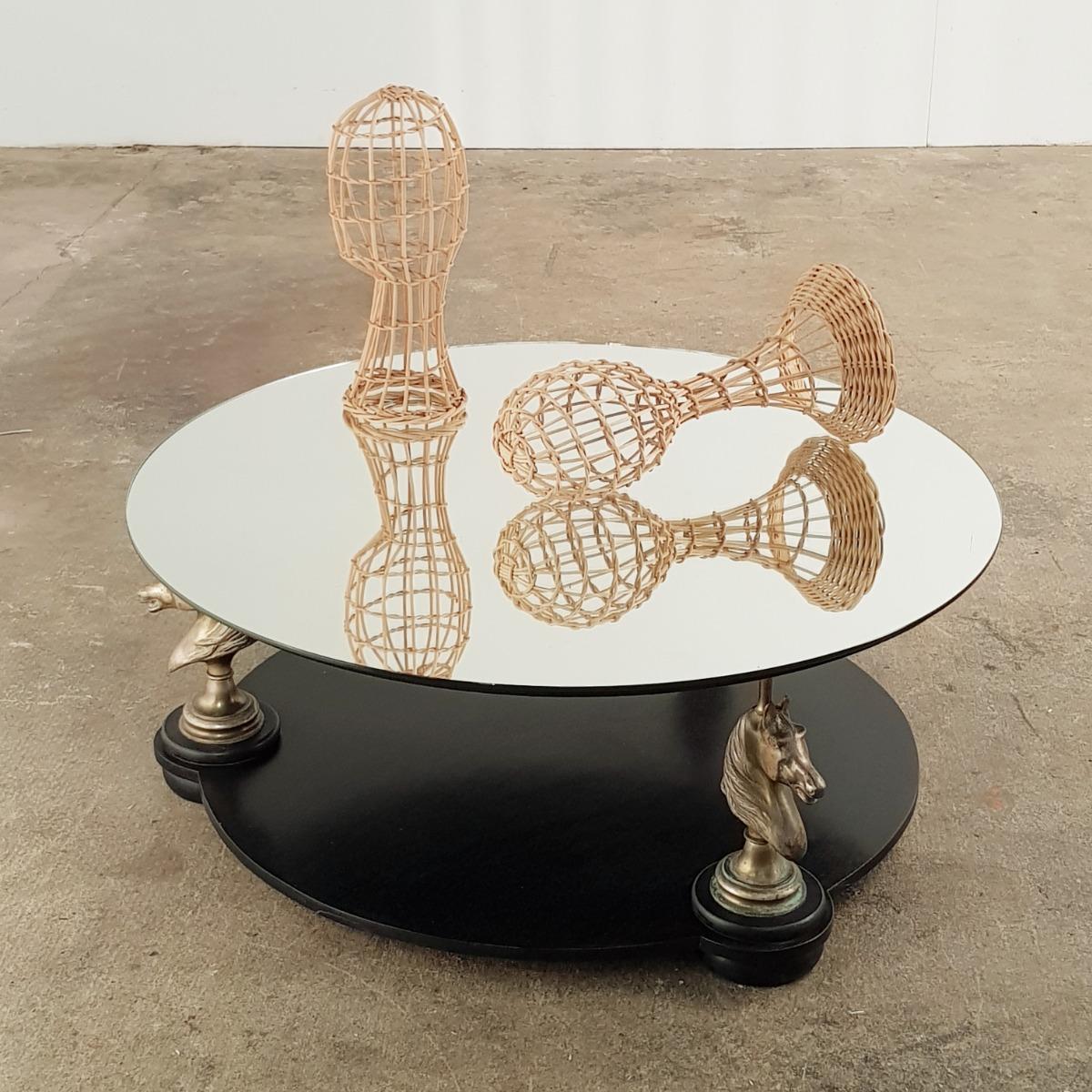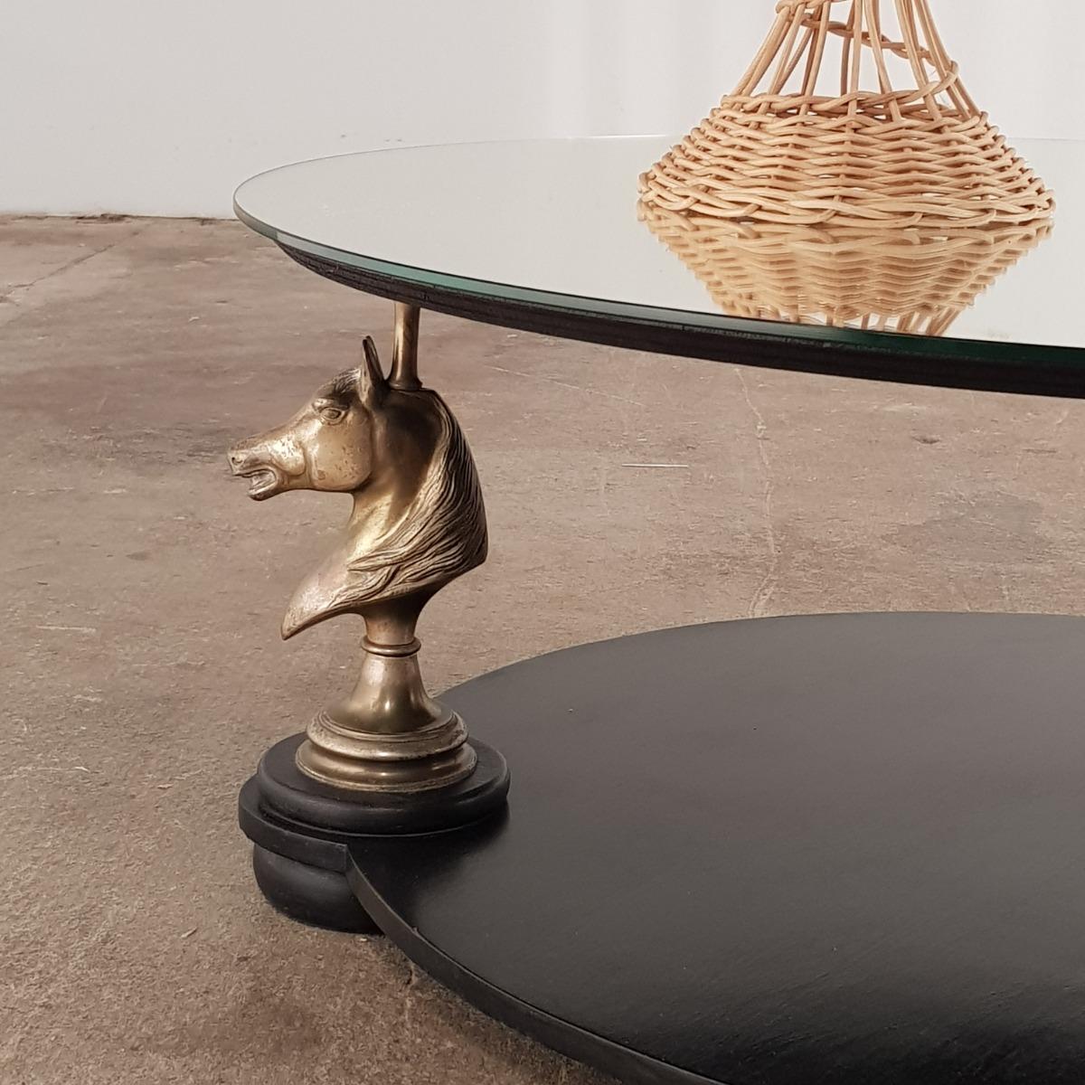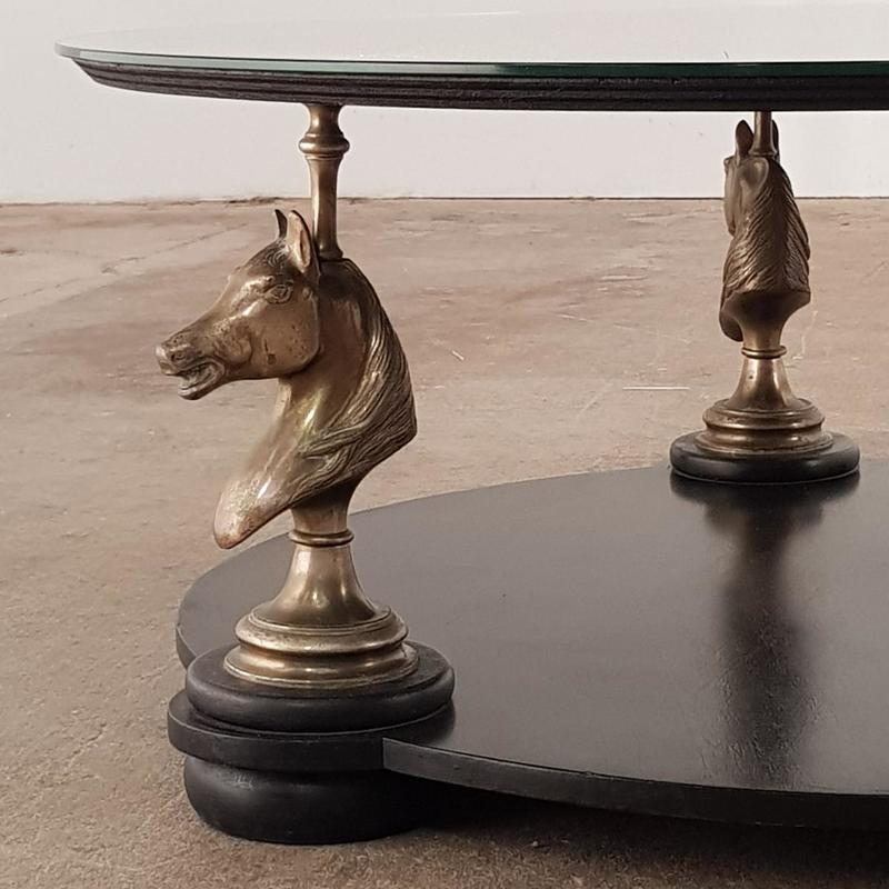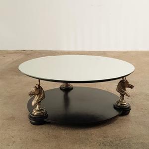 Elegant wooden coffee table mounted on 3 brass horse heads with new mirror top, very good condition, France 1970