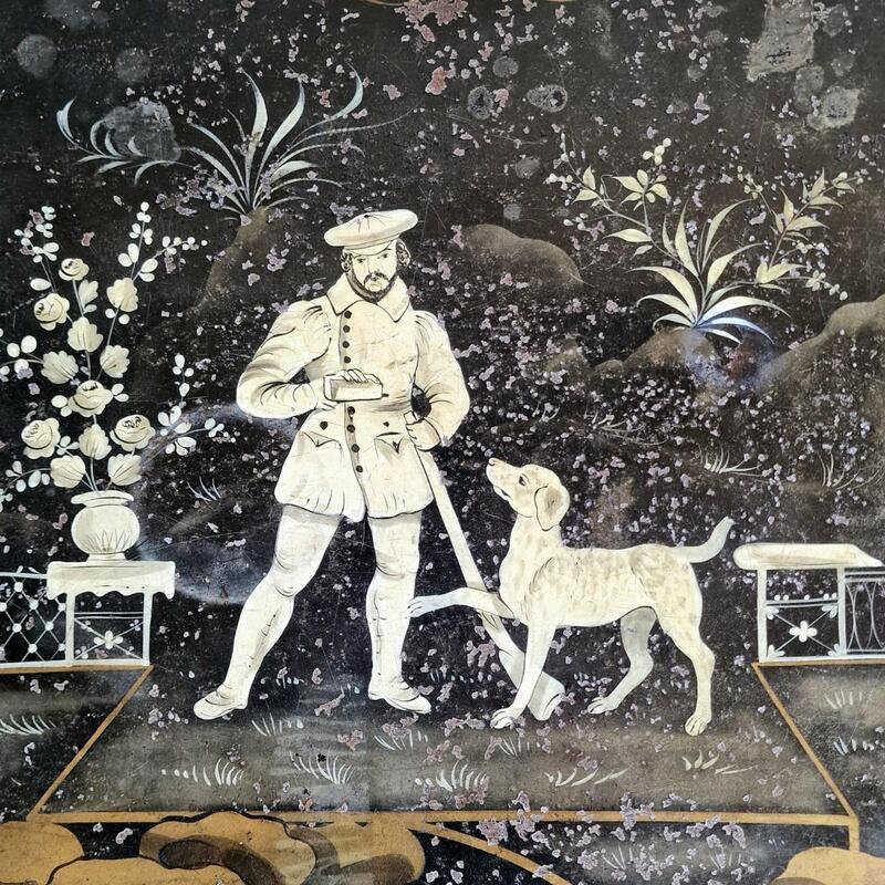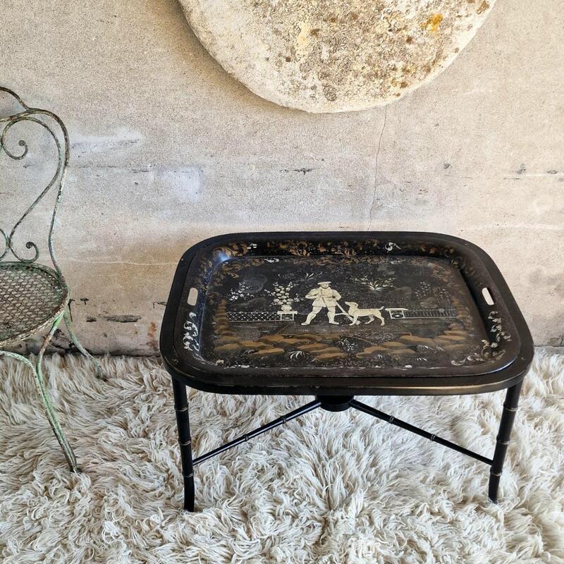 An admirable side table with removable hand-painted metal tray showing a hunter with his dog, on black wooden base with bamboo imitation legs, very good and stable condition, initials and number on backside tray, France Mid 20thC