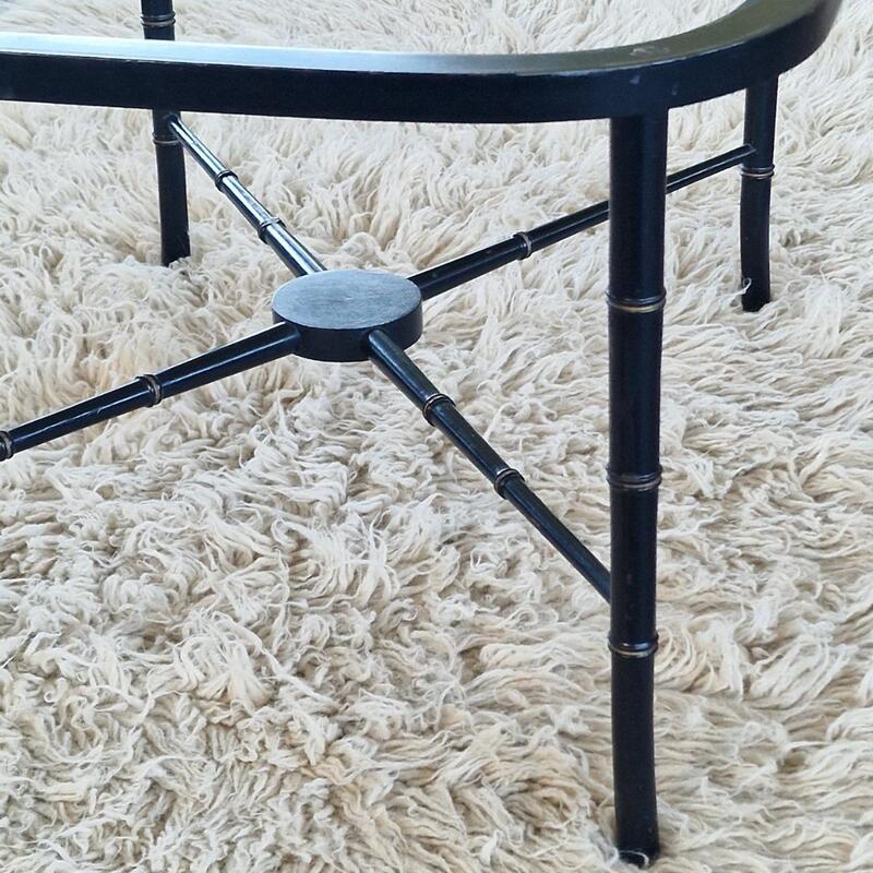 An admirable side table with removable hand-painted metal tray showing a hunter with his dog, on black wooden base with bamboo imitation legs, very good and stable condition, initials and number on backside tray, France Mid 20thC