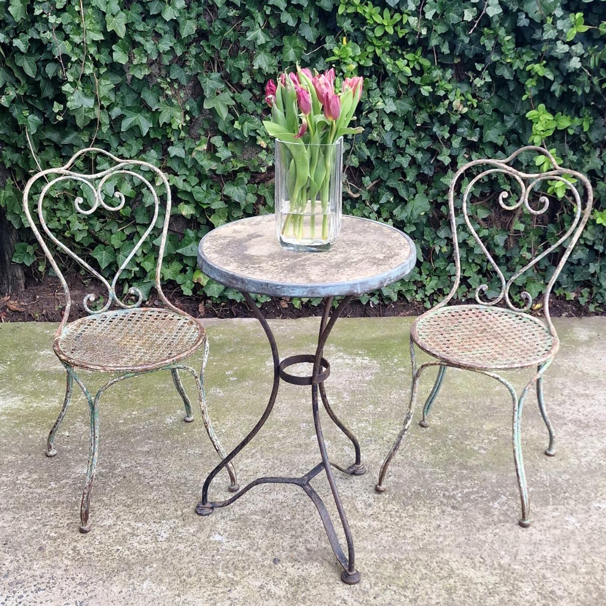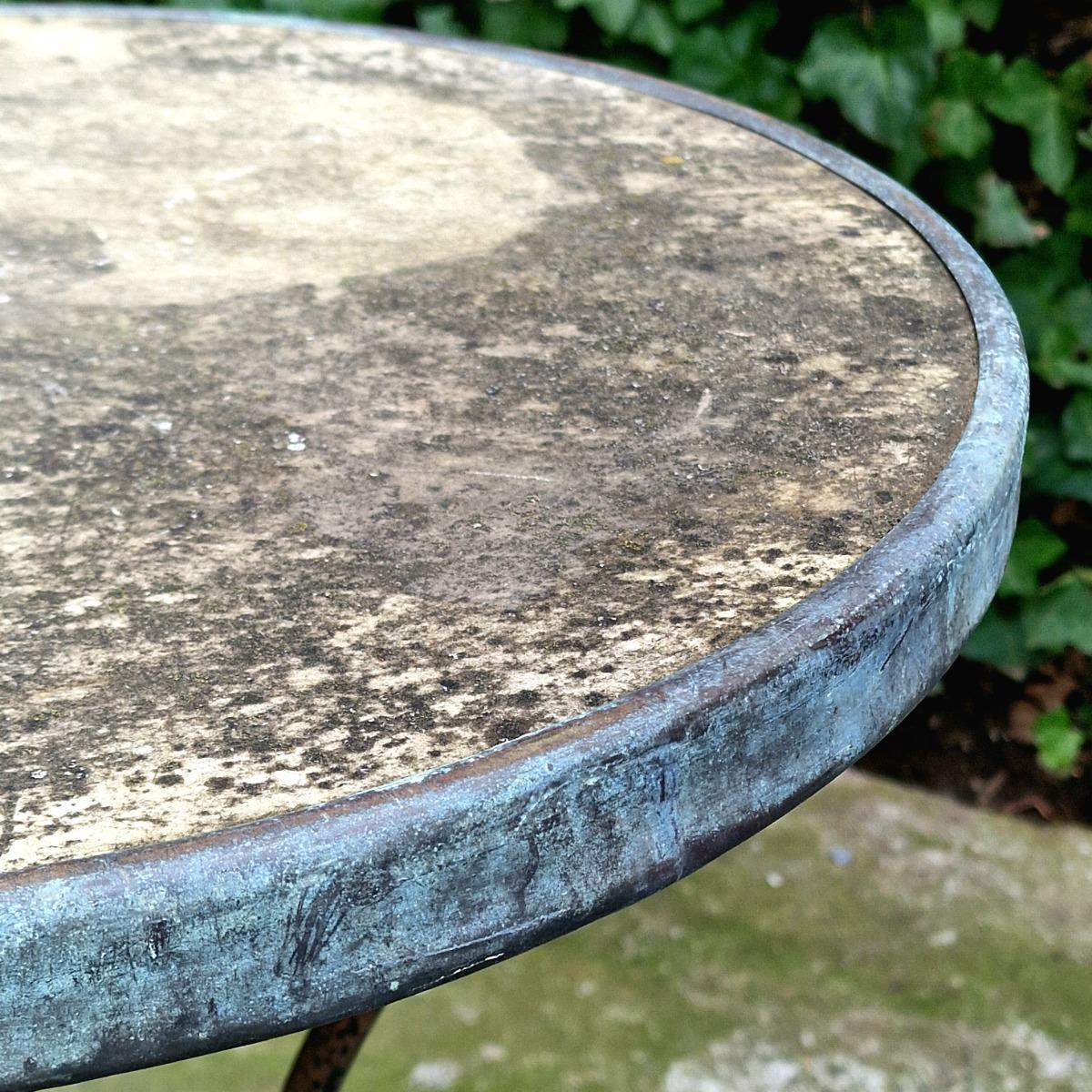 A classy small garden table made of a cast iron base and thick round copper-rimmed marble top, watch the special pastille table feet, lovely weathered top and base, very good and stable condition, France 1880
