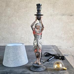 A delightful spelter Pharaoh lamp made of a candle stick, painted in lovely origiinal colours, used patina, very good condition, lamp shade included, France 1890