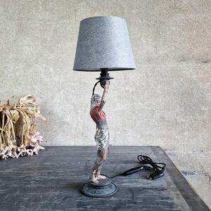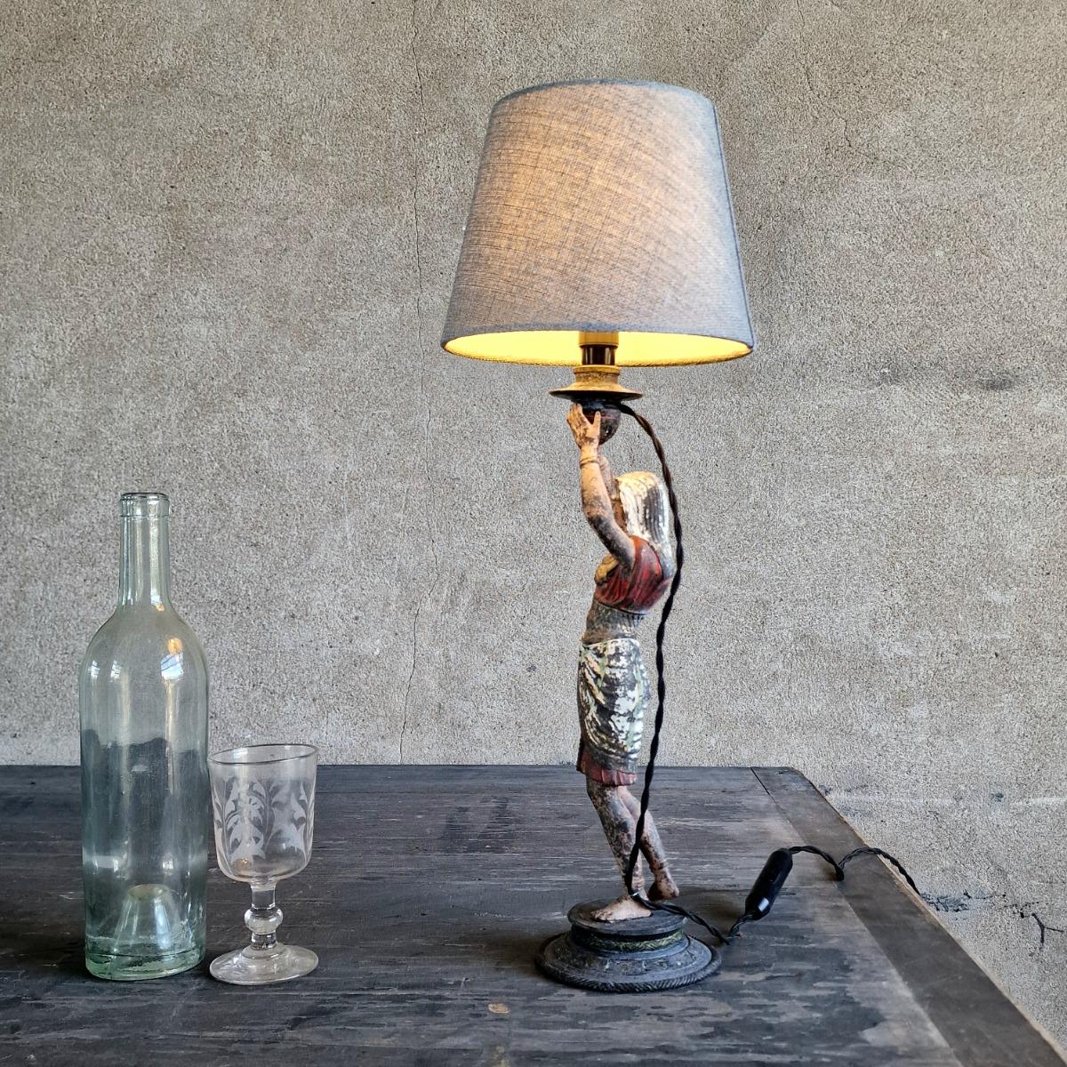A delightful spelter Pharaoh lamp made of a candle stick, painted in lovely origiinal colours, used patina, very good condition, lamp shade included, France 1890