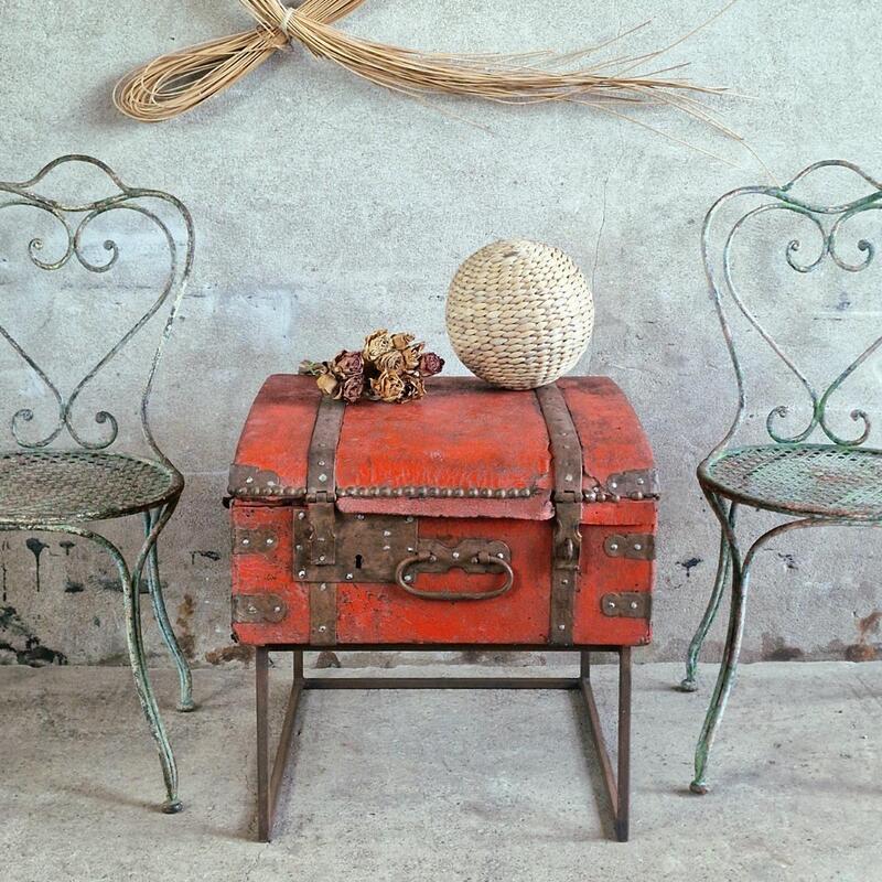 A pleasing old suitcase on bespoke base, red case made of wood and leather on linear metal stand, the perfect side table to store your small items in the 3 compartments, good used condition, France 19thC