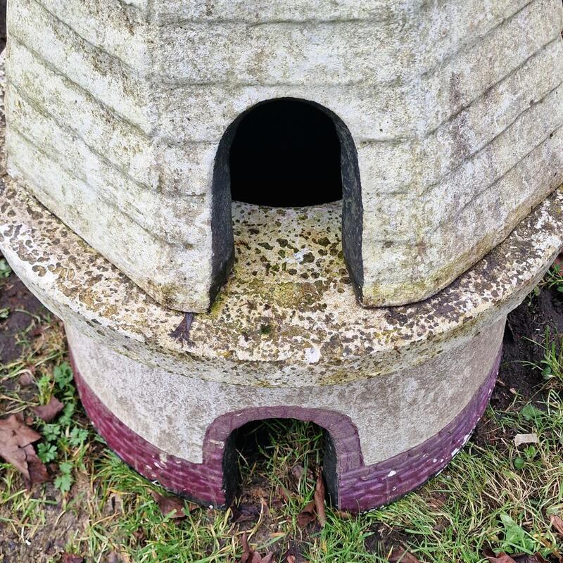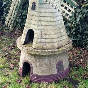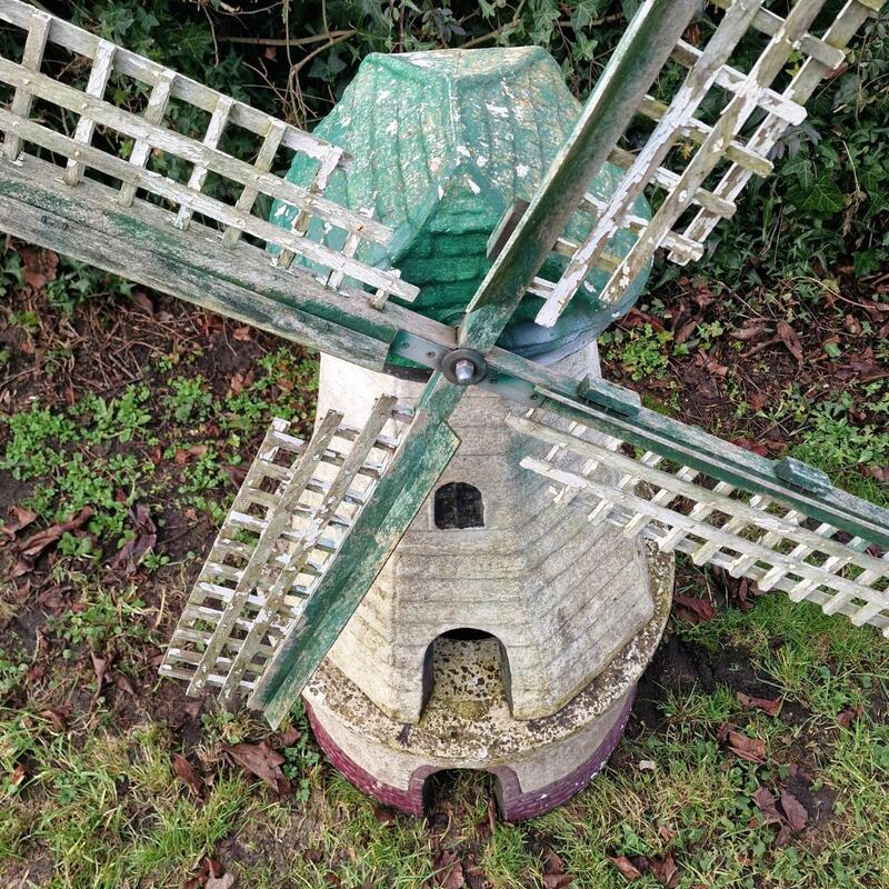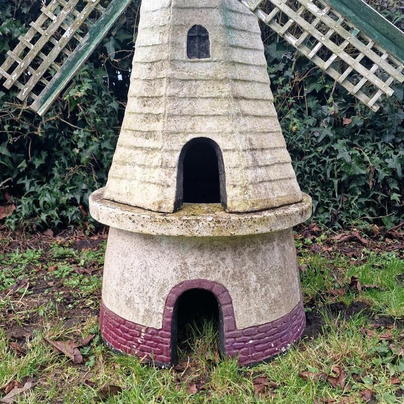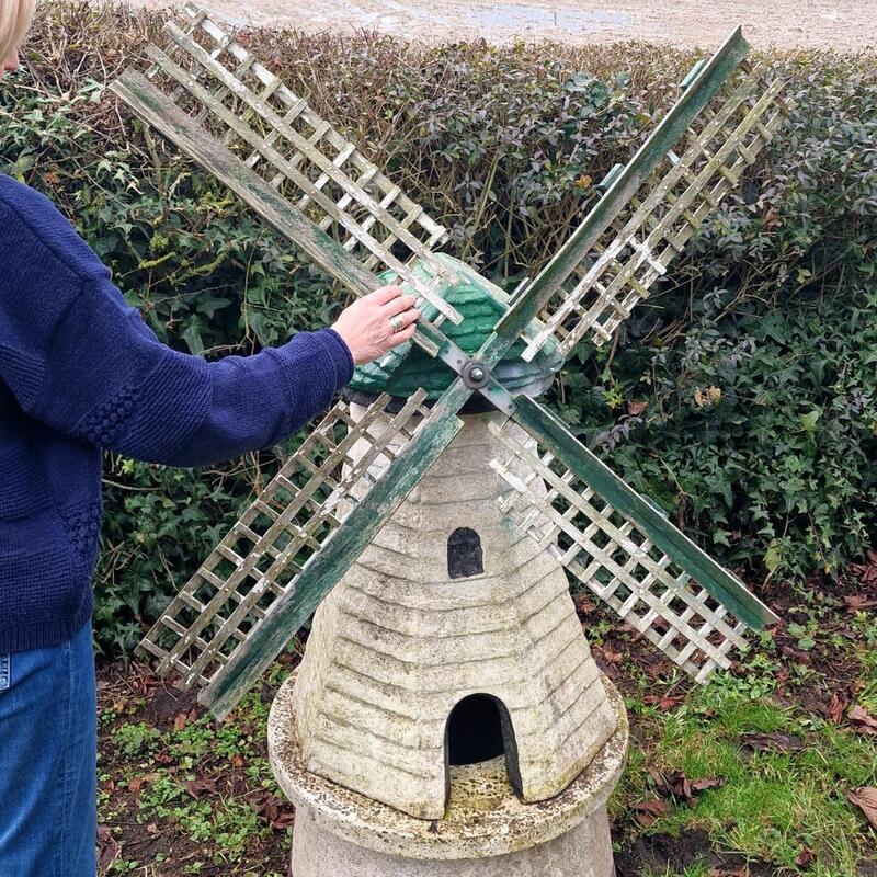 A delightful cast stone mill with wooden wings, lovely weathered original paint, consists of 4 parts so easy to transport, rather rare in this large size, very good condition, Belgium 1960