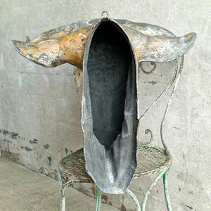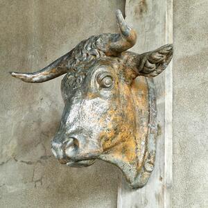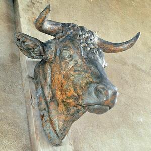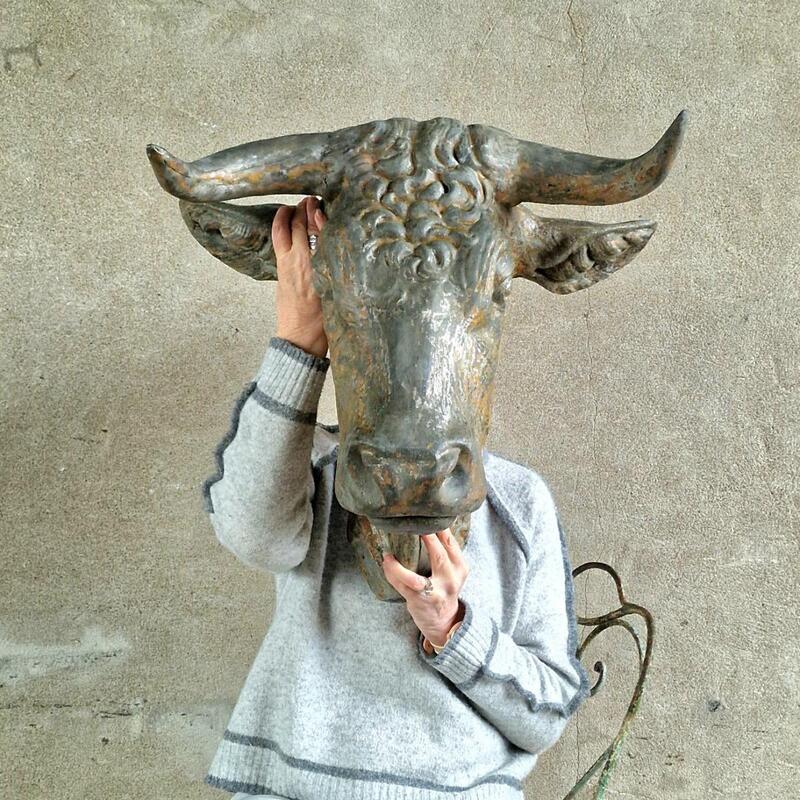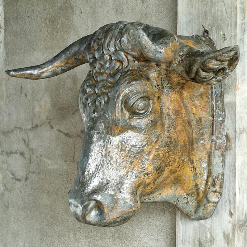 A fantastic XL zinc bull's head originating from a French 19thC butcher's shop, stripped surface with remains of original paint, good condition with some skillful restorations, France 1880