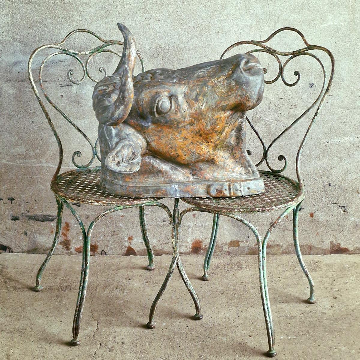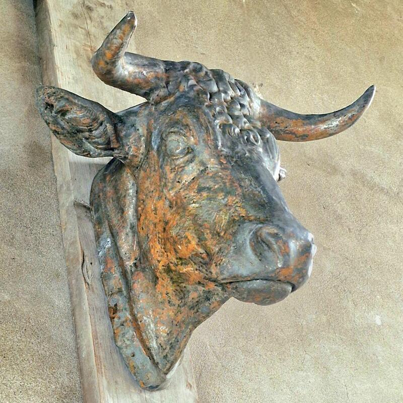 A fantastic XL zinc bull's head originating from a French 19thC butcher's shop, stripped surface with remains of original paint, good condition with some skillful restorations, France 1880